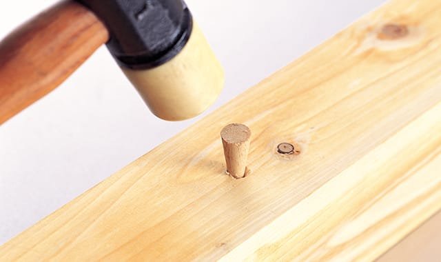 Pagamintą kaištį sutepkite medienos klijais ir tvirtai įkalkite į paruoštą skylę. Nupjaukite likusia kaiščio dalį ir nušlifuokite paviršių.